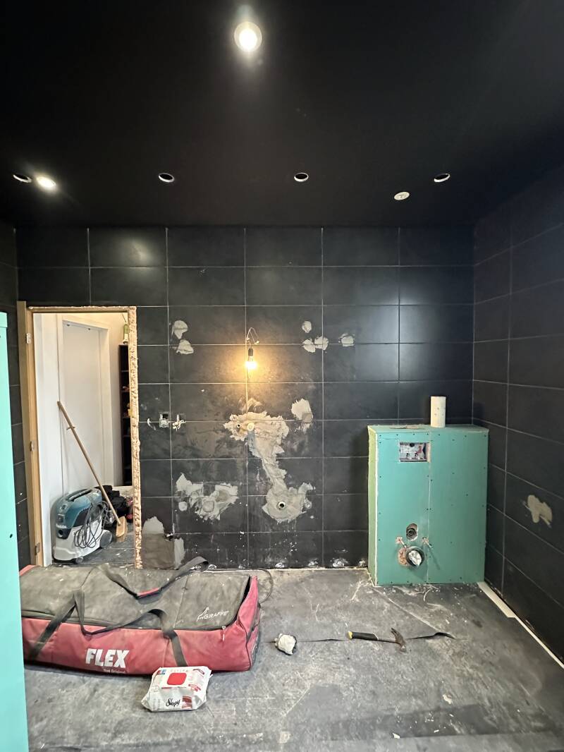 1. Controle van de bestaande tegels: Voor we starten controleren we altijd of alle tegels nog stevig aan de muur zitten. Losse tegels worden plaatselijk verwijderd en de zone wordt eerst hersteld voor we verder gaan. Tijdens dit project ontdekten we enkele losse tegels.